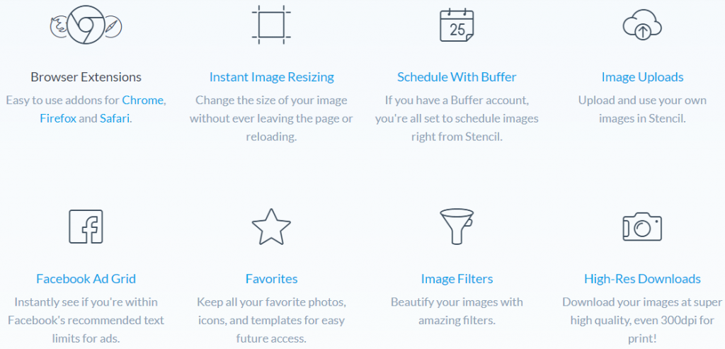 The stencil is built to be a simple-to-learn and easy-to-use application that presents a rich set of features that enables both the tech-savvy and beginner to create graphics for their websites, blogs, and social media channels. The main features include background photos, amazing templates, upload and store logos, quotes, Google web fonts, Upload fonts, easy customization, icons and graphics, and chrome extension.